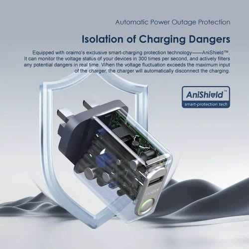 Equipped with oraimo's exclusive smart-charging protection technology——AniShield™. It identifies voltage situation of your devices and actively filters any potential dangers in real time. When the voltage fluctuation exceeds the maximum input of the charger, the charger will automatically disconnect the charging.