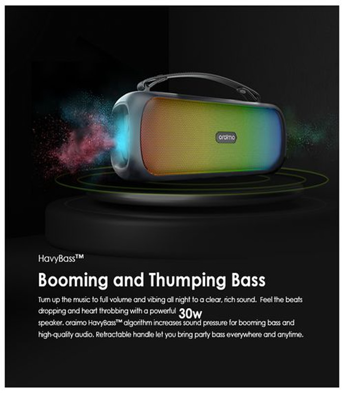 Turn up the music to full volume and vibing all night to a clear, rich sound. Feel the beats dropping and heart throbbing with a powerful 30W speaker. oraimo HavyBassâ„¢ algorithm increases sound pressure for booming bass and high-quality audio. Retractable handle let you bring party bass everywhere and anytime.