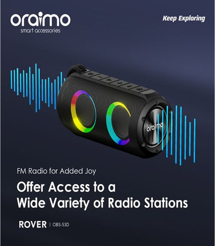 Product Features:oraimo Sound Promise-Full Bass to Put You in the ZoneCustomized dual 50mm full-range drivers and dual 66mm bass radiators deliver superior stereo sound. oraimo HavyBassâ„¢ DSP enhances deeper bass, richer instrument details, crisper voice with dual digital processing chip by acoustics experts. Experience powerful sound with oraimo Rover.