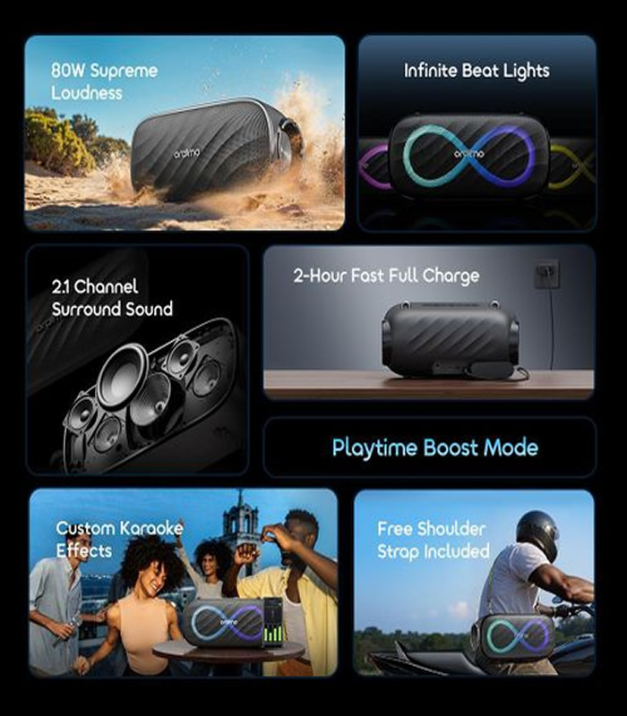 Product Features: 80W Supreme Loudness Turn Up the Heat, Feel the Beat Experience the power of 80W explosive oraimo signature sound, driven by dual advanced digital audio amplifier chips and exclusive HavyBassâ„¢ technology. Boost your adventure with Bass Mode, elevating basslines and drums to the next level. Infinite Beat Lights Visualize Your Rhythm Innovative infinite lightshows makes your music into a visual spectable based on exclusive beat adaptive algorithm. Customize infinite light motions and colors by oraimo sound app to glow your party. Custom Karaoke Effects Endless Singing Fun Host unforgettable karaoke nights by plugging in a microphone (not included in the package), then tune the bass, treble, reverb and accompaniment music by oraimo sound app to get just the right singing vocals. Let you be a singer star in the party. 2.1 Channel Surround Sound An Immersive Hearing Feas Featured a 4 inch subwoofer, dual 2 inch tweeters and dual 3 inch passive radiators and balanced by acoustic crossover technology, the SpaceBox Pro delivers ultra deep bass, clear and sonorous highs. 2-Hour Fast Full Charge On-The-Go Temporary Powerbank With 35W fast charging, SpaceBox Pro fully charges in 2 hours while its the built-in 10W powerbank keeps your devices powered. Playtime Boost Mode Long-Lasting Battery for Endless Grooves Enjoy up to 13-20 hours music wherever you go and activate Playtime Boost Mode in the oraimo sound app, you can enjoy up to 24-27 hours music. Free Shoulder Strap Included Carry Music with Ease The speaker includes a free detachable shoulder strap, ensuring you can take your music wherever you go. Whether hiking, camping, or just relaxing, the strap allows you to free your hands and travel light. Google Pop-Up Notification Smart and Fast Pairing Connect seamlessly between SpaceBox Pro and your Google devices with fast pairing. Multiple Connected Modes Easy Pairing, Various Playing Bluetooth 5.4 Talk Mirophone Aux-in Memory Card USB Drive True Wireless Stereo(TWS) Mode oraimo sound app More Customizable Options Download the oraimo sound app today and immerse yourself in a world of rich, emotionally charged audio experiences that turn every moment into an unforgettable adventure. Galaxy Trail Fluid Texture Elevate Your Style Effortlessly Infinite dazzling lights combined with the galaxy trail fluidity texture create a stunning visual and aesthetic experience, making every moment shine like a shooting star across the night sky.